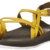 - UPPER: Double-strapped polyester jacquard webbing upper wraps around the foot and through the midsole for a customized fit Toe loop for secure movement Adjustable and durable high-tensile webbing heel risers Injection-molded ladder Lockbuckle MIDSOLE: Women’s specific LUVSEATPU midsole Extra-soft PU compound Topographic textured grooves on footbed for traction Vegan-friendly construction OUTSOLE: Non-marking EcoTread25%-recycled rubber compound 3mm lug depth